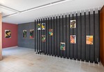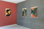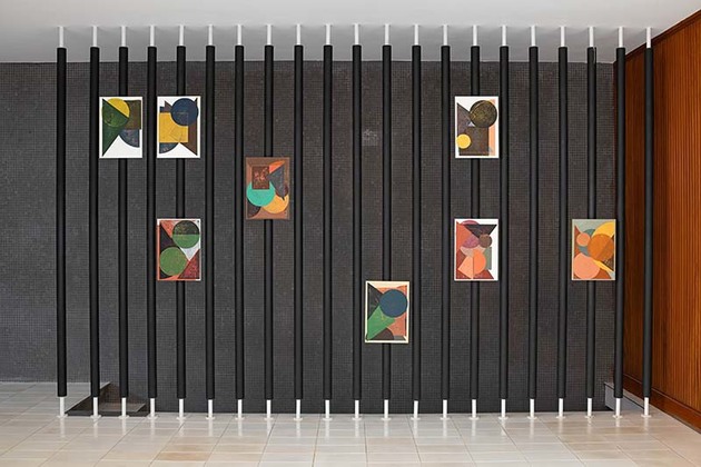 Essa grande pesquisa norteia a série de trabalhos que dá nome à exposição, Gnomonic Woods (2025). Embora inspiradas no vocabulário esotérico que compõe os relógios de sol (círculos, semi-circulos, corações, triângulos, cruzes, trapézios etc), essas xilogravuras trazem a espontaneidade do momento da produção em estúdio e revelam os cerne da prática escultórica do artista, que traz os sistemas combinatórios agora aplicados à linguagem pictórica. Essa é a primeira vez que ele trabalha sem planejamento, seguindo um protocolo que permite o acaso tanto na sobreposição de cores, quanto na desconstrução dos elementos do relógio do sol, diversificando as formas. Tecnicamente, a prática é similar à da xilografia, onde ele cobre com tinta os pedaços de madeira recortados em triângulos, círculos, quadrados etc, e aplica no papel. Uma vez pronta a composição, o artista fixa o papel em uma placa de madeira, elemento recorrente na sua prática e que também surge como uma maneira de experimentar sobreposições de formas e cores. Essas camadas de processo tornam cada trabalho único.