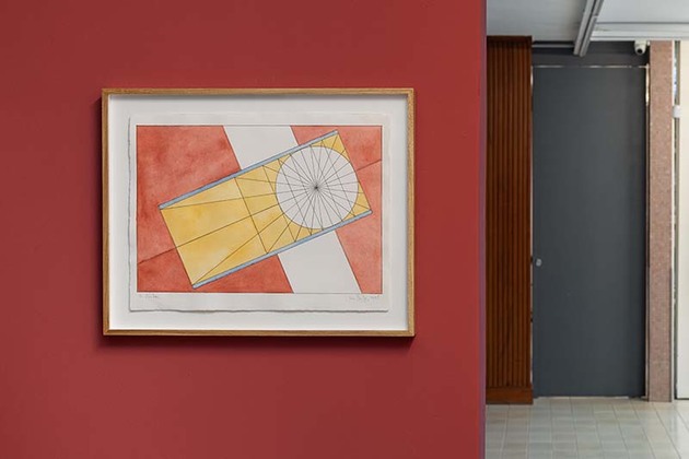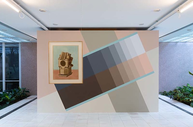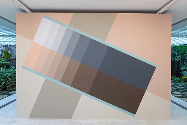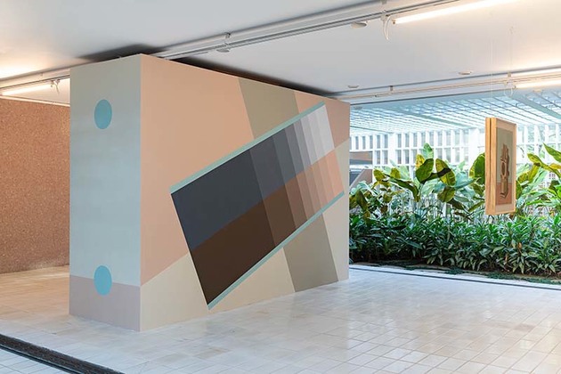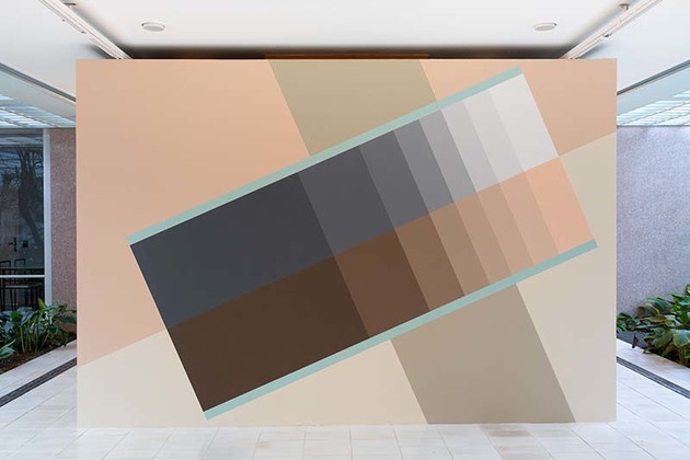 Já na parede principal da Sala Modernista da galeria, o artista apresenta uma pintura de parede projetada exclusivamente para a exposição. Pensada para representar a localização da cidade de São Paulo, a pintura traz linhas transversais que não apenas representam a latitude da cidade, como também fazem uma alusão aos ponteiros, que nos relógios de sol são chamados de gnomon, ou ponteiros de sombra. Na pintura, as tonalidades das cores pasteis remetem ao degradê das sombras, interrompidas por duas pinturas menores que retratam os relógios de sol, produzidas por machetaria, tinta e gesso. Os processos de criação envolvem um estudo profundo de outras gravuras ou objetos, projeção da versão 3D e finalizando com a renderização axonométrica. A machetaria, técnica artesanal que consiste em incrustar pequenas peças de madeira, remete à técnica utilizada pelo artista na combinação das peças de madeira da série Prismatiques.