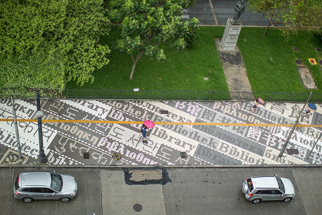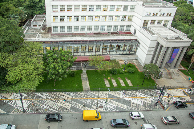 Obra pública da artista, ao um só tempo iconoclasta e reverente, ocupa permanentemente calçadas ao redor da biblioteca municipal de São Paulo