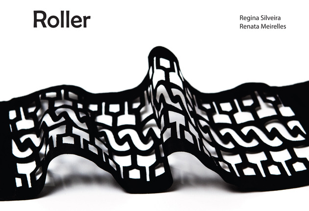 Since 2004 Regina Silveira has been working on Derrapagens [Skid Marks], an ongoing series composed of installations created with laser cut self adhesive vinyl. The works are usually site specific and display overlapping graphic patterns of tires that interfere in the architecture, which serves simultaneously as medium and as artistic content. Inspired by Derrapagens, the artist has created the Roller series, a limited, numbered and signed collection of pieces of contemporary textile jewellery. The project is fruit of a partnership between the artist and the designer Renata Meirelles, known for her wide experimentation with laser cut patterns on fabric – a technic related to Silveira’s Derrapagens. Together, they created a sort of digital lace that establishes sensorial relations with the adorned body.