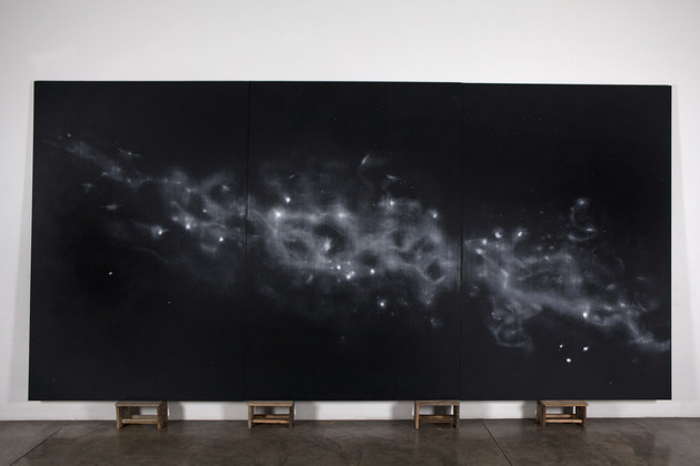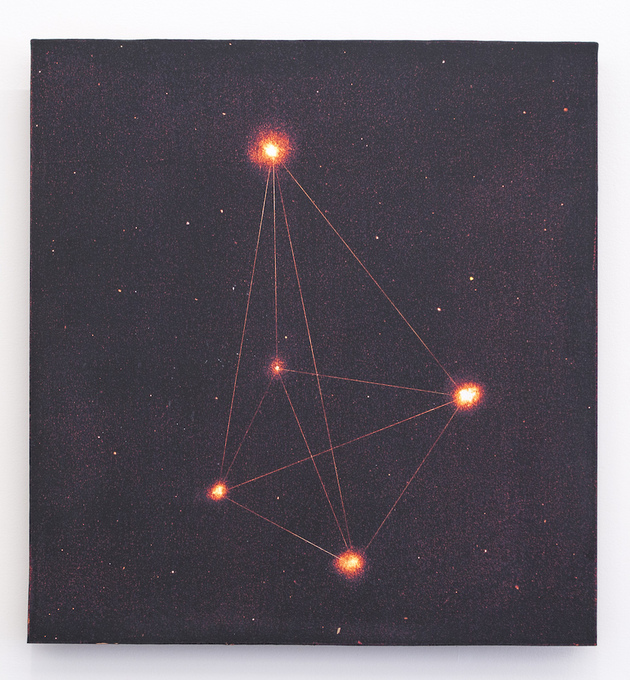 Tiago Tebet (São Paulo, 1986) presents in the Biennial two paintings from the series Cruzeiro do Sul [Southern Cross]: Cruzeiro do Sul and Variações de Cruzeiro do Sul [Variations of Southern Cross], both from 2015. While making significant portion of its production in painting, Tebet moves through different artistic languages such as video and installation. By the appropriation of techniques, shapes and objects – be them from urban areas or found in art history –, Tiago Tebet develops a contemporary research, in which the representative character of the artwork loses relevance compared to other conceptual and formal aspects of aesthetic configuration, which is understood more as enactment than representation. Allusions to nature and the cosmos have been made present in some of his recent works, often as a way to point to something beyond of (or prior to) our hypermodern society.